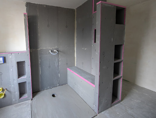 Jan built the partition wall for his shower using Qboard® on metal studwork. It lends the room a totally new structure and also made it possible to incorporate a shelving unit at the same time.